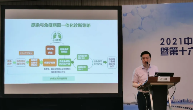 一直以來,間質性肺疾?。↖LD)的診治都是呼吸科醫師常常需要面對的棘手難題。程主任首先以幾個生動病例為切入點,向與會聽眾介紹了間質性肺疾病的一般分類、臨床特點、診斷路徑和影像學表現,并分享了自己在診治間質性肺疾病的個人經驗,如獨特皮疹的指向性和超薄CT的診斷價值。隨后,程主任從免疫學檢測和病原學檢測兩個角度,詳細介紹了間質性肺疾病的一體化臨床診斷。