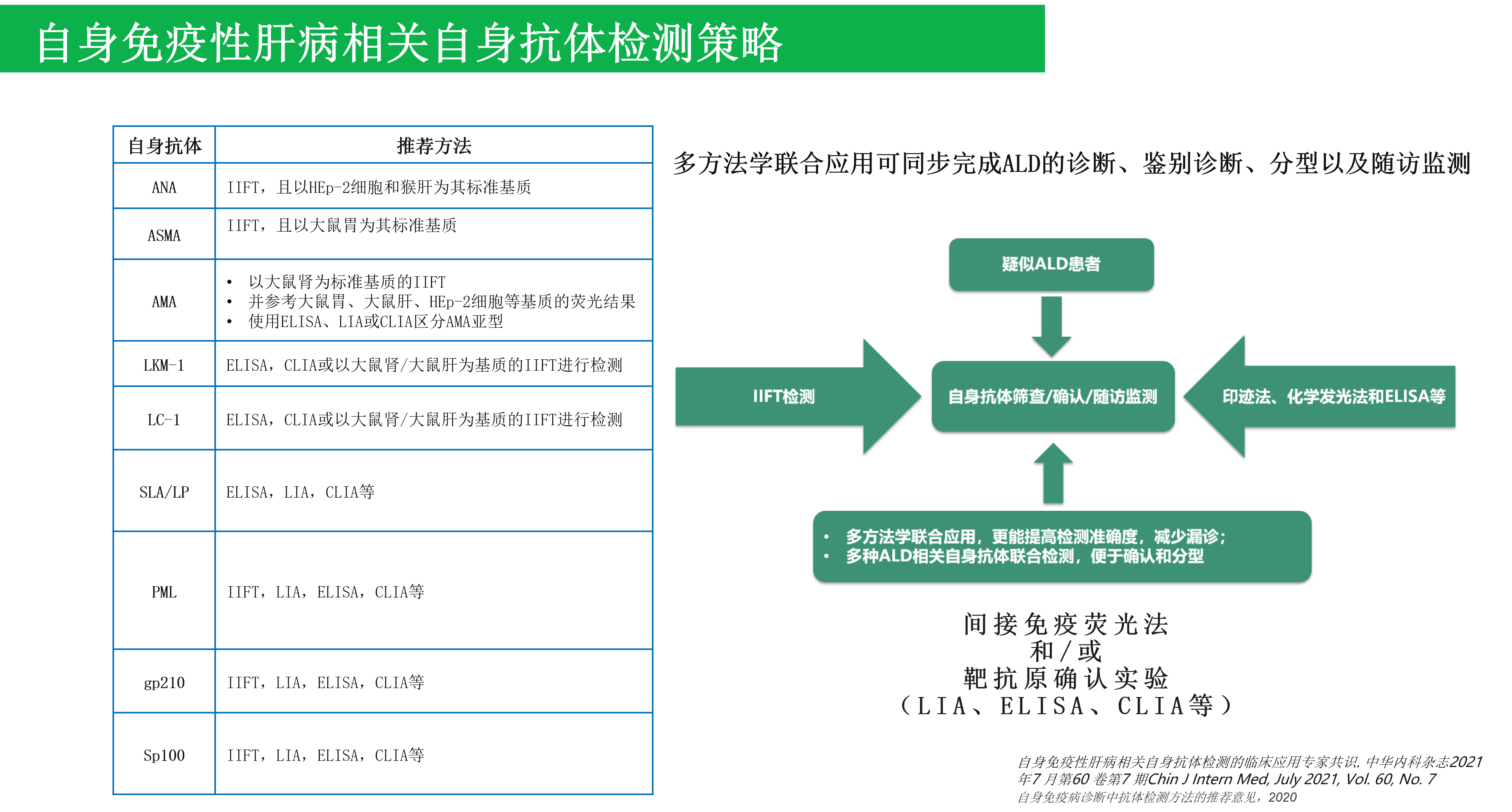 仲教授以自身免疫性肝病(ALD)相關自身抗體的檢測為例,結合各個方法學的特點,介紹了針對ALD相關自身抗體的一體化檢測策略,即間接免疫熒光法初篩,免疫印跡法、化學發(fā)光法或ELISA法確認靶抗原,多種方法聯合檢測提高檢測準確度。 同時,也對抗SLA/LP抗體、抗LKM-1抗體、抗LC-1抗體、抗gp210抗體、抗Sp100抗體的臨床應用價值進行了簡要說明。