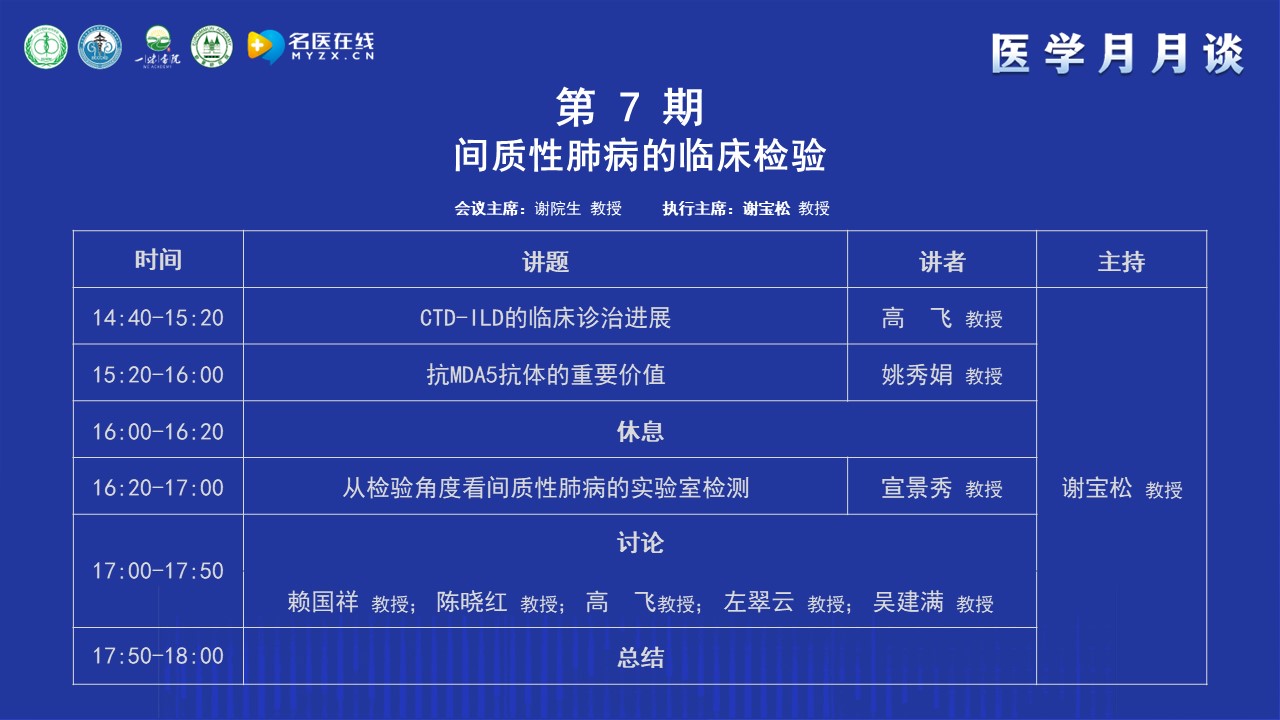衷心感謝大會(huì)主席謝院生教授為我們搭建這一高水平的學(xué)術(shù)交流平臺(tái)。本次會(huì)議我們榮幸地邀請(qǐng)到臨床、檢驗(yàn)、影像學(xué)等多領(lǐng)域的專(zhuān)家學(xué)者,共同圍繞間質(zhì)性肺病的臨床檢驗(yàn)與診療這一主題展開(kāi)深入的學(xué)術(shù)講座與研討。