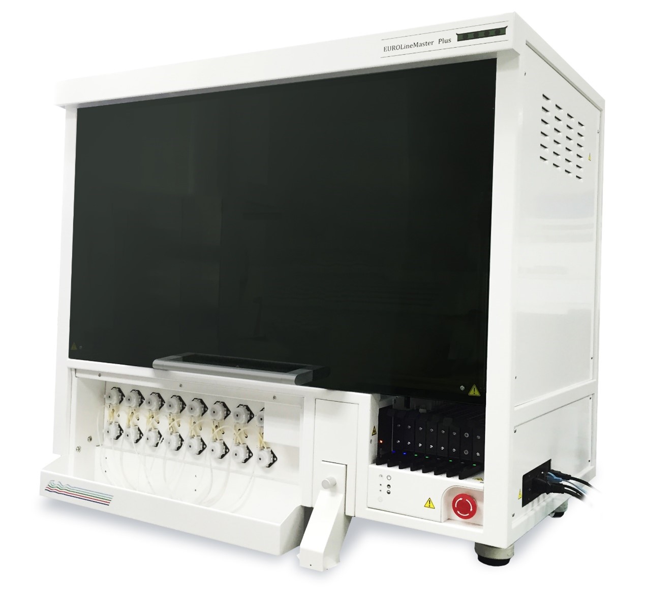 EUROLineMaster Plus-A全自動(dòng)免疫印跡檢測系統(tǒng)采用歐蒙最新的高通量多參數(shù)免疫檢測技術(shù),是目前使用更先進(jìn)、應(yīng)用更成熟的一個(gè)多指標(biāo)檢測技術(shù)平臺。儀器具備16個(gè)試劑通道,可在一次檢測運(yùn)行中,組合自身免疫、過敏原和感染診斷領(lǐng)域的檢測。可實(shí)現(xiàn)從加樣到結(jié)果輸出的全自動(dòng)操作及全流程管理,實(shí)現(xiàn)從樣本識別、樣本稀釋、所有孵育及清洗過程,到自動(dòng)成像、圖像分析與處理的全自動(dòng)操作,最終出具可自定義的檢測報(bào)告,可真正實(shí)現(xiàn)無人值守。